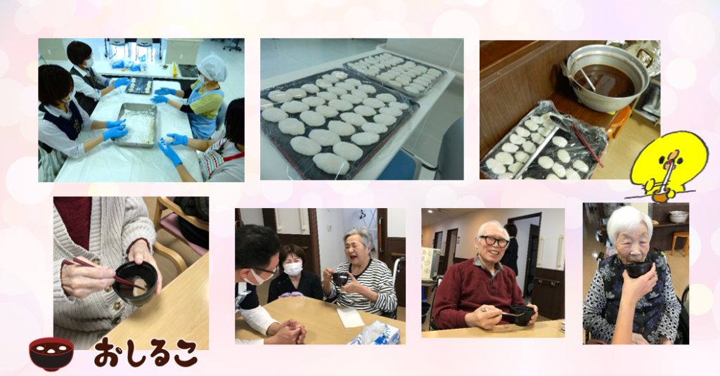 全入所者様にお餅を食べていただくことは中々難しいですが、ついたお餅が入ったのお汁粉の方、とても小さくしたお餅のお汁粉の方…それぞれお汁粉を堪能されていました。