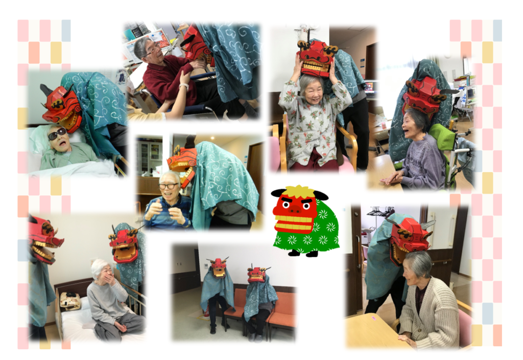 お正月🎍ということもあり…介護さん手作りの獅子舞が皆さんのところを回ってくれました。